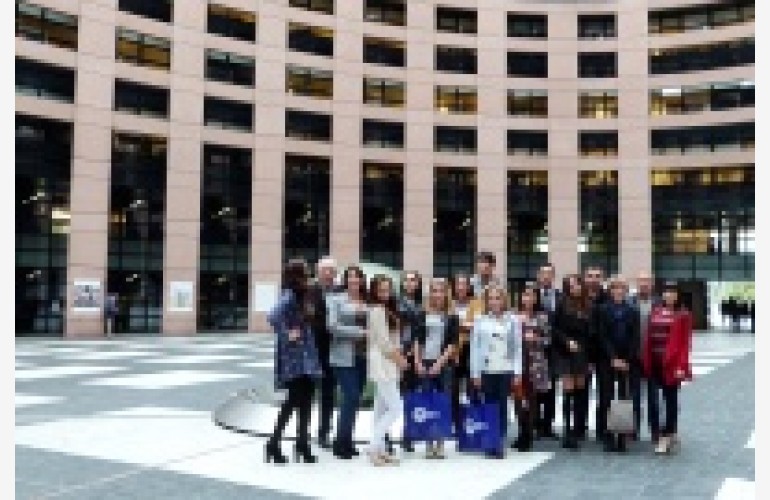 W Parlamencie rolę gospodarza czynił prof. Mirosław Piotrowski, który zapoznał studentów ze strukturą tej instytucji, frakcjami politycznymi, składem narodowym, a także z aktualną agendą rozpoczynającego się posiedzenia. Przebywając w obiekcie grupa mogła zobaczyć główne wejście z czerwonym dywanem i tzw. ścianką, na tle której przybywający do Parlamentu oficjalni goście pozują do zdjęć. Podobne miejsce jest też wewnątrz, gdzie wykonana została wspólna fotografia z europosłem.