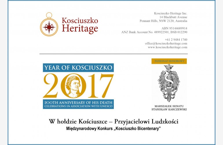 Z okazji Roku Kościuszki ogłoszonego przez Sejm i Senat Rzeczypospolitej, świętowanego pod auspicjami UNESCO z okazji dwusetnej rocznicy śmierci Kościuszki, ogłoszono Międzynarodowy Konkurs «Kosciuszko Bicentenary».