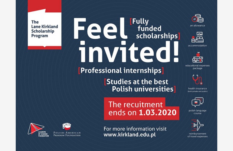 Polsko-Amerykańska Fundacja Wolności oraz Fundacja Liderzy Przemian ogłaszają kolejną edycję otwartego konkursu na stypendia im. Lane'a Kirklanda w Polsce w roku akademickim 2020–2021.