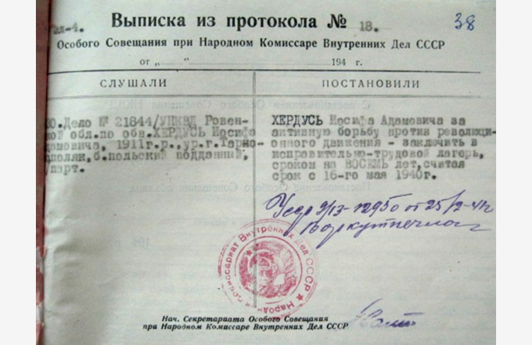 Według postanowienia Prokuratury Obwodu Rówieńskiego z dnia 7 lipca 1989 r. wobec Józefa Herdusia zastosowano art. І Ustawy Prezydium Rady Najwyższej ZSRR z dnia 16 stycznia 1989 r. «O dodatkowych przedsięwzięciach dotyczących odnowienia sprawiedliwości wobec ofiar represji, mających miejsce w okresie lat 30–40 – na początku lat 50».