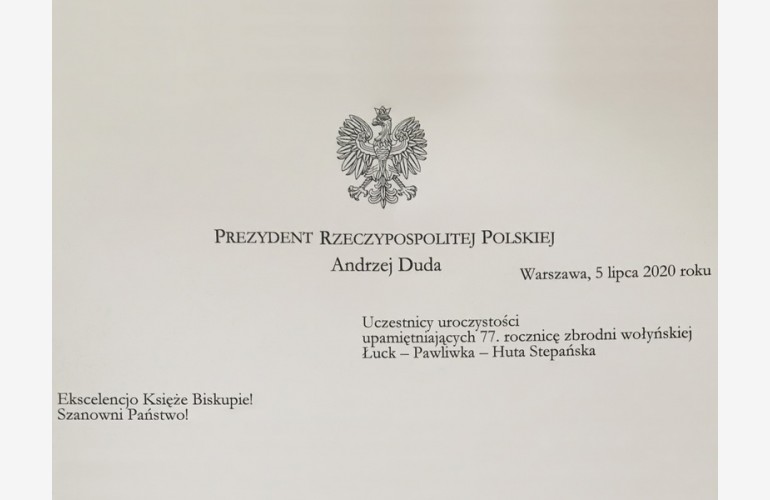 Prezydent RP Andrzej Duda skierował list do uczestników uroczystości upamiętniających 77. rocznicę zbrodni wołyńskiej w Łucku, Pawliwce i Hucie Pieniackiej na Ukrainie – podaje Ambasada RP na Ukrainie.