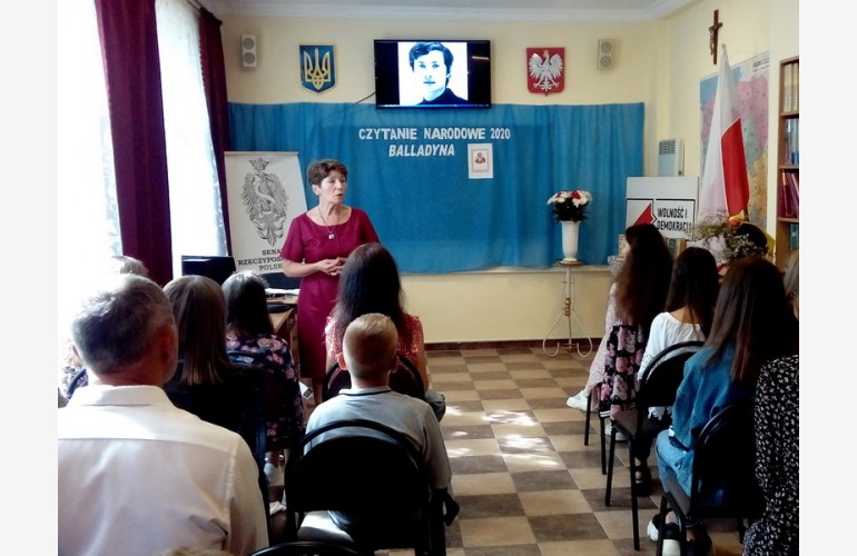 Spotkanie rozpoczęto od wysłuchania nagrania Pary Prezydenckiej zapraszającej do czytania utworu Słowackiego. Następnie jedna z uczestniczek przybliżyła sylwetkę autora zwracając szczególną uwagę na miejsce jego urodzenia w pobliskim Krzemieńcu. Dopełnieniem informacji o poecie była prezentacja wierszy «W pamiętniku Zofii Bobrówny» i «Do Matki» w wykonaniu uczniów.