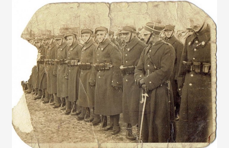 Zdjęcie z 1 września 1939 r. wykonane w Smarkowie przedstawiające oddział żołnierzy tuż przed wyruszeniem na front (Stefan Młynarczyk – siódmy od prawej strony)