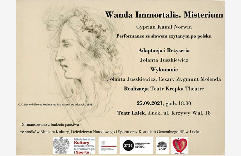 Konsulat Generalny RP w Łucku oraz Teatr Kropka Theatre zapraszają na spektakl «Wanda Immortalis. Misterium» na podstawie utworu Cypriana Kamila Norwida pt. «Wanda. Rzecz w obrazach sześciu».