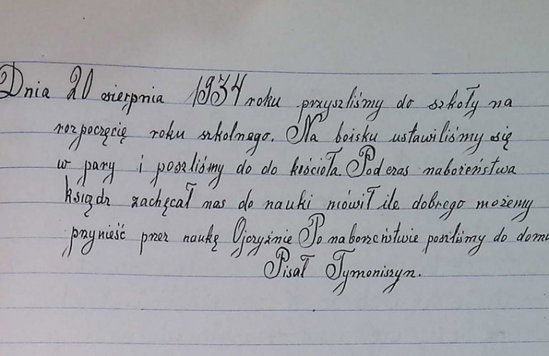 Dnia 20 sierpnia 1934 roku przyszliśmy do szkoły na rozpoczęcie roku szkolnego. Na boisku ustawiliśmy się w pary i poszliśmy do kościoła. Podczas nabożeństwa ksiądz zachęcał nas do nauki mówił ile dobrego możemy przynieść przez naukę Ojczyźnie. Po nabożeństwie poszliśmy do domu. Pisał Tymoniszyn. (tu i dalej została zachowana oryginalna pisownia – red.)