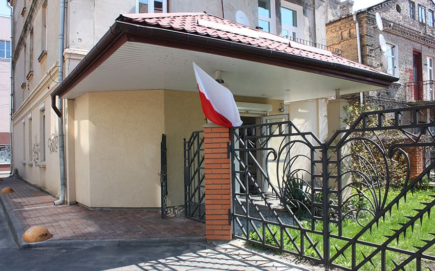 Na zdjęciach Anatola Olicha flaga polska na siedzibie