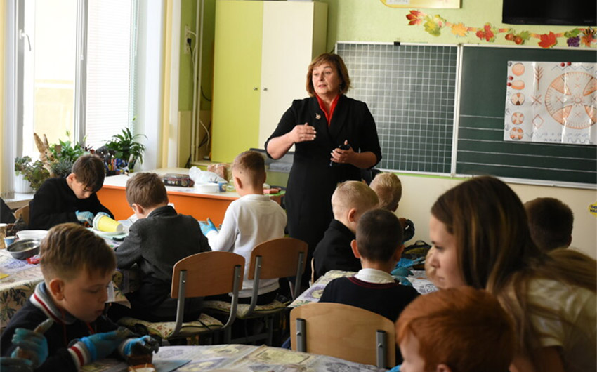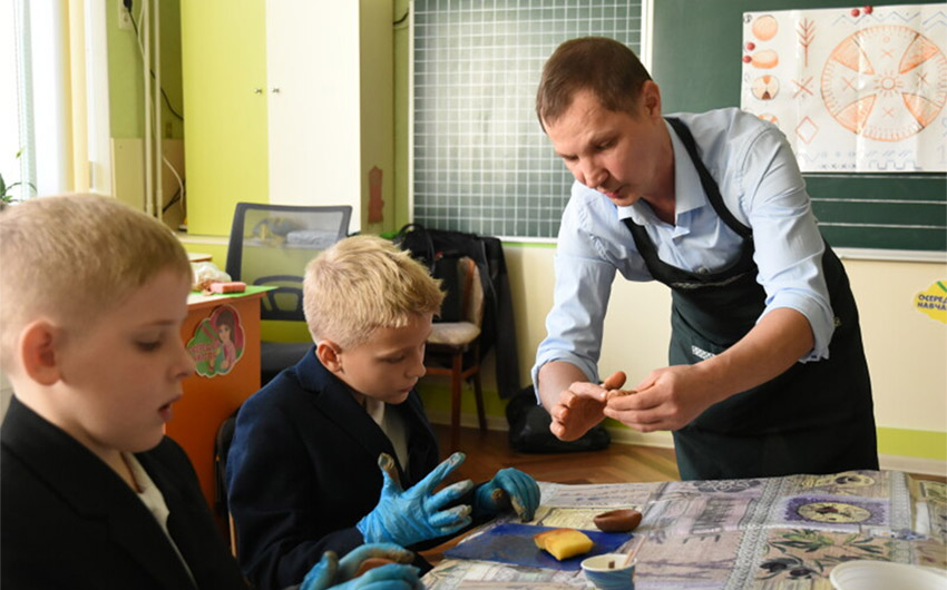 Pan Anatolij podzielił się też swoimi sekretami, jak rozpocząć własną działalność gospodarczą lub prywatną produkcję, jak skutecznie sprzedawać swoje wyroby i zwiększać zyski. Na zajęciach panowała twórcza atmosfera. Dzieci tworzyły własne talerze z autografami i słuchały gry mistrza na ludowych instrumentach muzycznych.