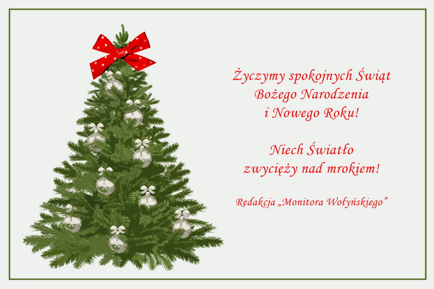 Przekazujemy w Państwa ręce ostatni w tym roku numer «Monitora Wołyńskiego». Na jego łamach piszemy m.in. o pracach prowadzonych przez konserwatorów w katedrze pw. Świętych Apostołów Piotra i Pawła w Łucku, stronie internetowej o łuckim cmentarzu katolickim, wystawie litografii wykonanych według rysunków Napoleona Ordy oraz o wizytach Świętego Mikołaja w polskich organizacjach.