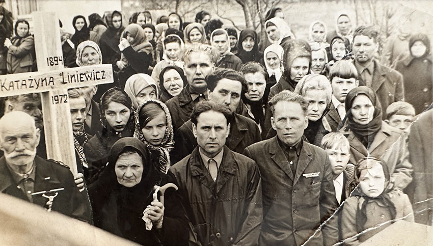 Pogrzeb babci Katarzyny. Matka Antonina w drugim rzędzie pierwsza od prawej strony. W centrum wujkowie Adolf i Witalij. Nad nimi Franciszek, Hipolit i Wiktoria. Franciszka druga po prawej stronie od krzyża. Na pierwszym planie ze świecą stoi Maria. 1972 r., obwód żytomierski