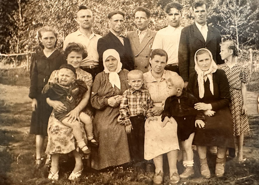 U babci Katarzyny (siedzi pierwsza od prawej strony). W górnym rzędzie stoją od prawej: ojciec Stanisław, wujek Hipolit, Witalij, Adolf. Początek lat 60., obwód żytomierski