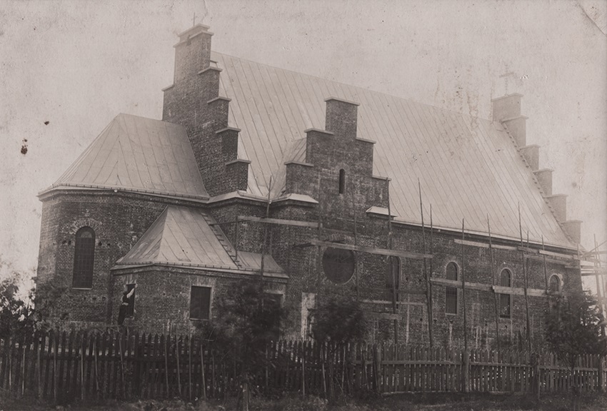 Budowa kościoła pw. Przemienienia Pańskiego w Maniewiczach, pocz. lat 30. Zdjęcie ze zbiorów Artura Aloszyna