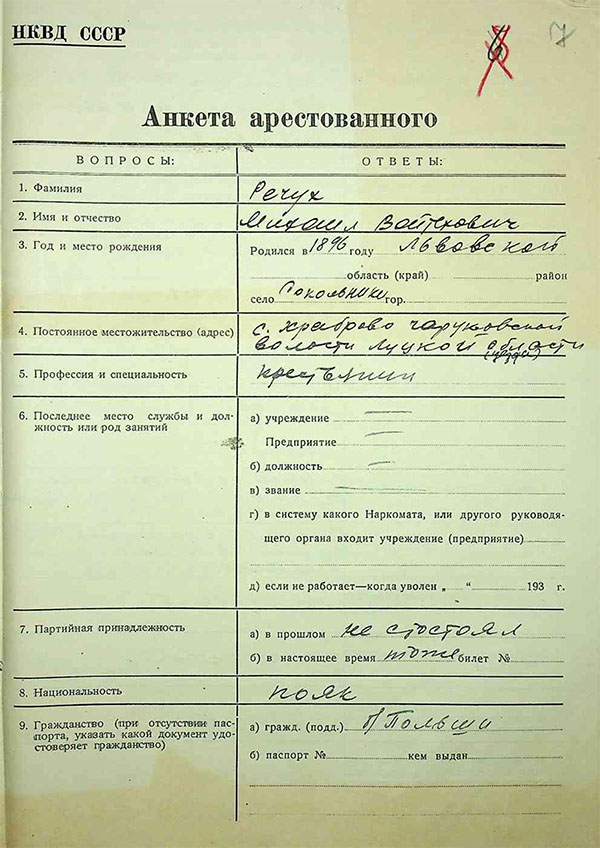 Pierwsze przesłuchanie, jak wynika z akt sprawy karnej przechowywanej obecnie w Państwowym Archiwum Obwodu Wołyńskiego, odbyło się 6 października. Starszy lejtnant Matwiejew zanotował, że Polak Michał Reczuch, s. Wojciecha, urodził się 4 września 1896 r. we wsi Sokolniki pod Lwowem. Pochodził z rodziny chłopskiej, ukończył siedem klas szkoły podstawowej, pracował z rodzicami we własnym gospodarstwie rolnym. Służył w wojsku: najpierw, w czasie I wojny światowej w latach 1914–1918, walczył w szeregach armii austriackiej, a od listopada 1918 r. do kwietnia 1921 r. – w Wojsku Polskim. Był plutonowym, ten stopień wojskowy Rosjanin Matwiejew wpisał do protokołu jako «unteroficer».