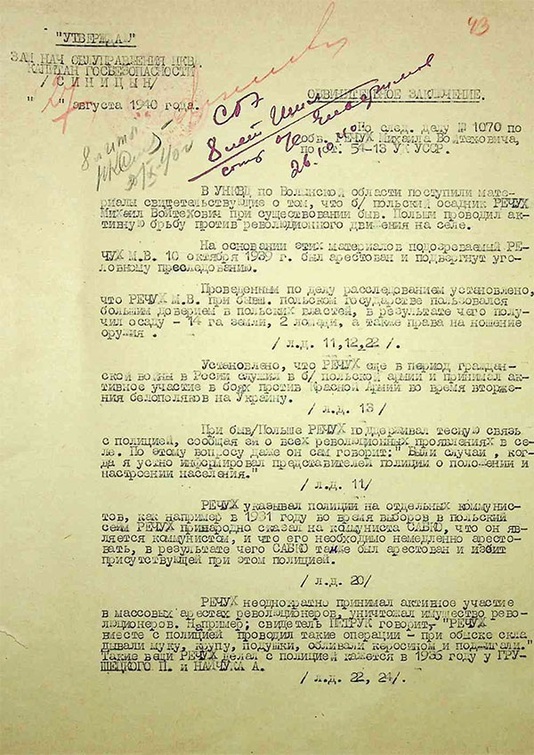 W sierpniu 1940 r. Michał Reczuch został oskarżony o «prowadzenie czynnej walki z ruchem rewolucyjnym na wsi, prześladowanie poszczególnych rewolucjonistów, donoszenie na nich władzom polskim, czyli popełnienie przestępstwa z art. 54–13 Kodeksu Karnego Ukraińskiej SRR». Sprawa została przekazana do rozpatrzenia przez Kolegium Specjalne NKWD ZSRR.