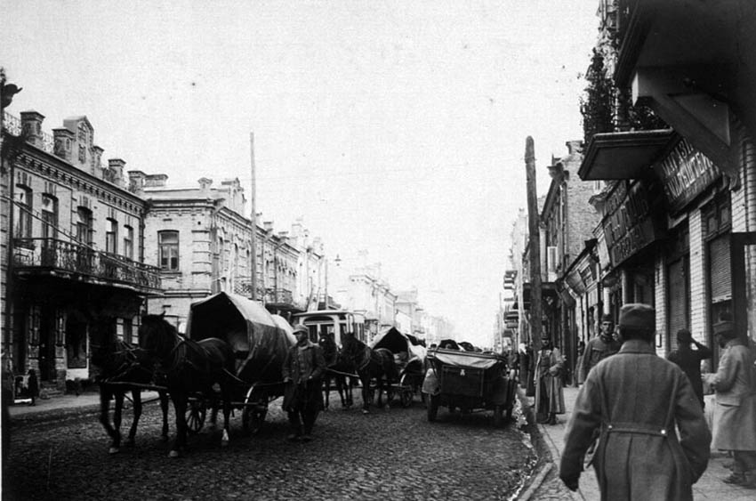 Konwój austro-węgierski przejeżdża przez ulice Hauptstraße w Łucku. Public domain