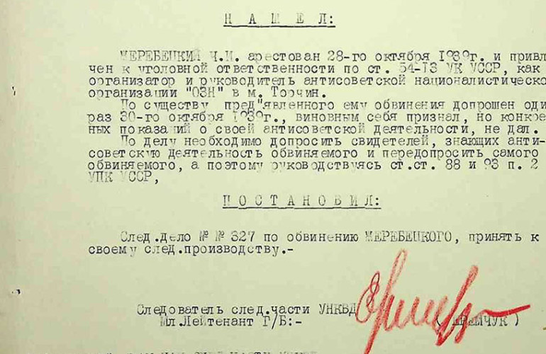 Ponieważ śledczym nie udało się znaleźć żadnych materiałów kompromitujących, 29 listopada przesłuchano świadka – Feodosija Golembiewskiego, członka Komunistycznej Partii Zachodniej Ukrainy od 1935 r. Ten stwierdził, że nic nie wie o działalności politycznej Żerebeckiego, o jego współpracy z policją ani działaczach OZN w Torczynie. Śledczy, najwyraźniej zirytowany takim zeznaniem, czyli jego brakiem, zadał nawet pytanie (cytujemy zgodnie z protokołem): «Jak to jest: wiedziałeś, że w twojej wsi istnieje partia OZN, ale nie wiedziałeś, kto był przywódcą tej organizacji?»
