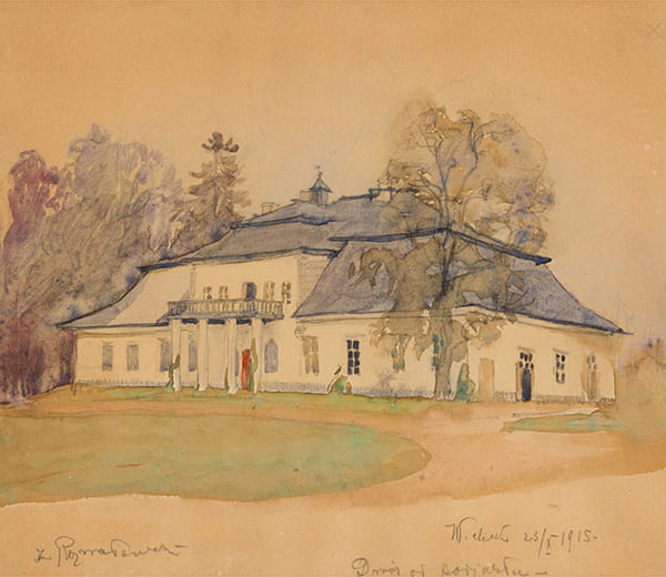 Dwór w Wielicku od strony podjazdu, 1915 r. Akwarela Zygmunta Rozwadowskiego. Zdjęcie pochodzi ze strony koneser.krakow.pl