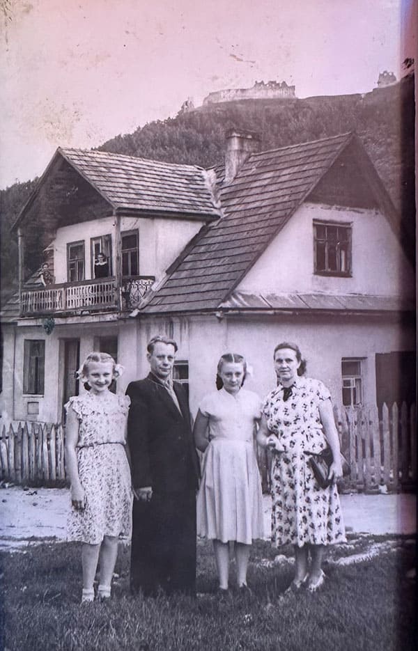 Bronisław i Dominika Bielicowie z córkami Stefanią (po lewej) i Stanisławą przed swoim domem. Krzemieniec, 1956 r.