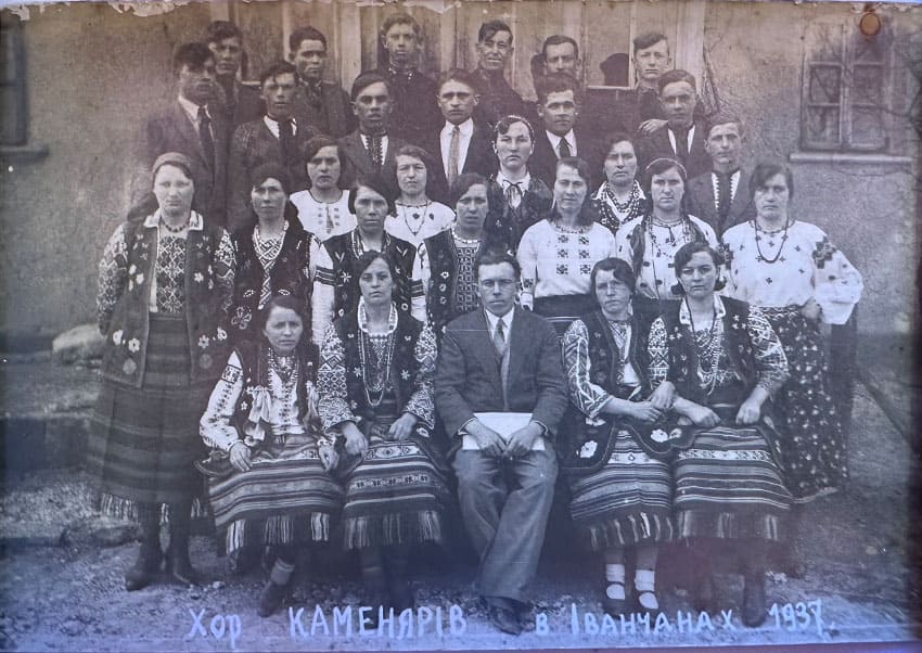 Chór «Kameniari» w Iwanczanach, 1937 r. W środku siedzi Andrij Mszaniecki, za nim stoi jego przyszła żona Helena Omelan