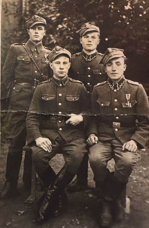 Bronisław Bielica (siedzi po lewej stronie) z kolegami z wojska. Ok. 1944 r.