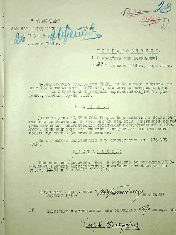 To właśnie na tych czterech dokumentach oparto całą sprawę karną. 20 stycznia 1940 r. funkcjonariusz jednostki śledczej Zarządu NKWD w Obwodzie Wołyńskim, sierżant bezpieczeństwa państwowego Krapiwin, doszedł do wniosku, że Chodorowski «był członkiem kontrrewolucyjnej organizacji powstańczej, brał czynny udział w przygotowywaniu zbrojnego powstania przeciwko władzy radzieckiej» i przedstawił mu zarzuty na podstawie artykułów 54–2 i 54–11 Kodeksu Karnego Ukraińskiej SRR.