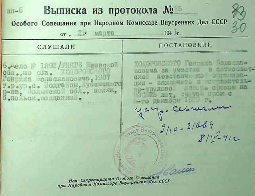 29 listopada 1940 r. Henrykowi Chodorowskiemu zostały przedstawione zarzuty, a sprawa została skierowana do Kolegium Specjalnego NKWD ZSRR. Zgodnie z protokołem nr 35 z dnia 29 marca 1941 r. Henryk Chodorowski został skazany na osiem lat w poprawczym obozie pracy, licząc od 6 grudnia 1939 r. Więzień odbywał karę w Siewpieczłagu.
