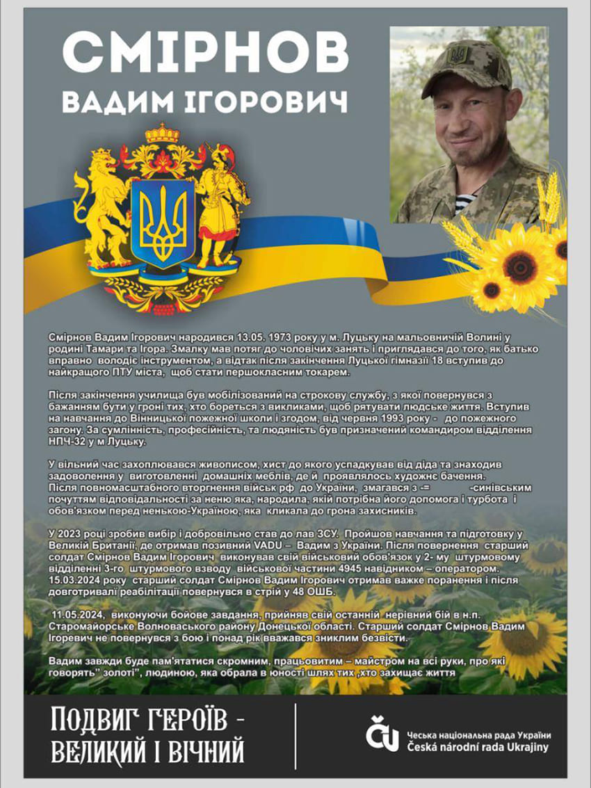 «W 2023 r. dobrowolnie wstąpił do Sił Zbrojnych Ukrainy. Przeszedł szkolenie i przygotowanie w Wielkiej Brytanii, gdzie otrzymał pseudonim VADU – Wadym z Ukrainy. Po powrocie starszy żołnierz Wadym Smirnow pełnił służbę wojskową w 2. oddziale szturmowym 3. plutonu szturmowego jednostki wojskowej 4945» – informuje Wołyńskie Obwodowe Towarzystwo Czechów «Matice Volyňská», którego członkiem był poległy żołnierz.