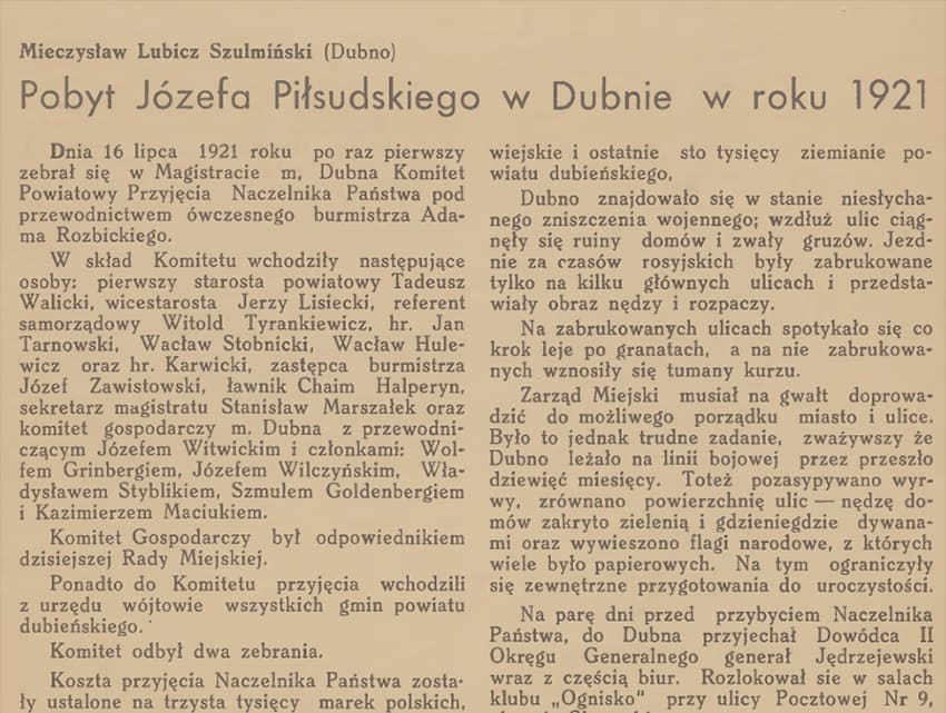 Proponujemy dziś uwadze Czytelników ciekawy dokument – artykuł «Pobyt Józefa Piłsudskiego w Dubnie» w roku 1921», opublikowany w nr 3 «Ziemi Wołyńskiej» za 1939 r., autorstwa miejscowego badacza Mieczysława Lubicza Szułmińskiego. Całość zachowujemy bez zmian, nawet duże litery, aby nie zniekształcać ducha tamtej epoki współczesnym pojmowaniem historii.