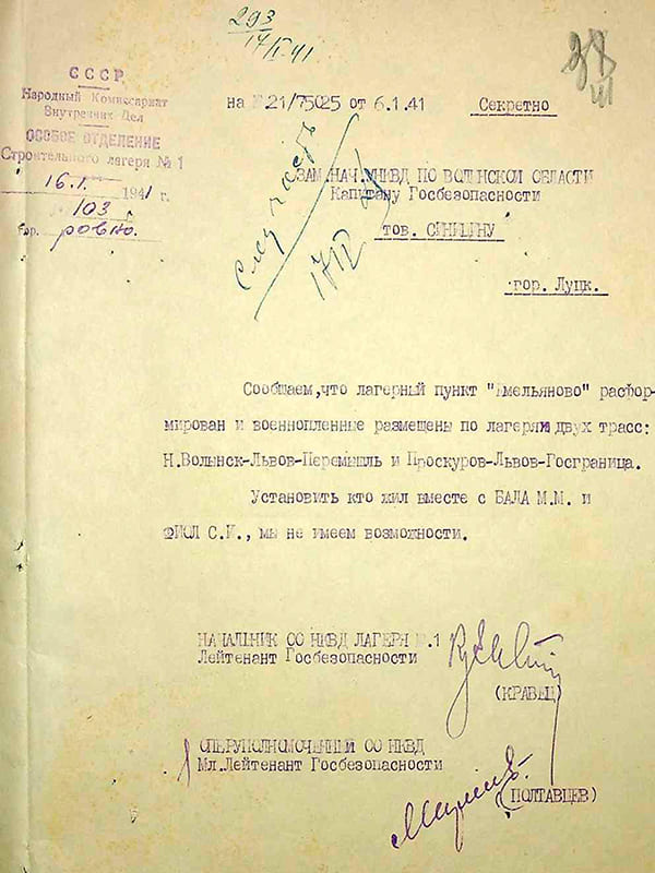 Jednocześnie zastępca naczelnika Zarządu Obwodowego NKWD, kapitan bezpieczeństwa państwowego Sinicyn z Łucka, zwrócił się z prośbą do naczelnika II oddziału Zarządu Obozów Jenieckich, lejtnanta bezpieczeństwa państwowego Fridmana z Równego, o przesłuchanie pięciu lub sześciu świadków spośród jeńców wojennych w celu ustalenia stosunku zatrzymanych do władz sowieckich i zapoznania się z ich dotychczasową działalnością.