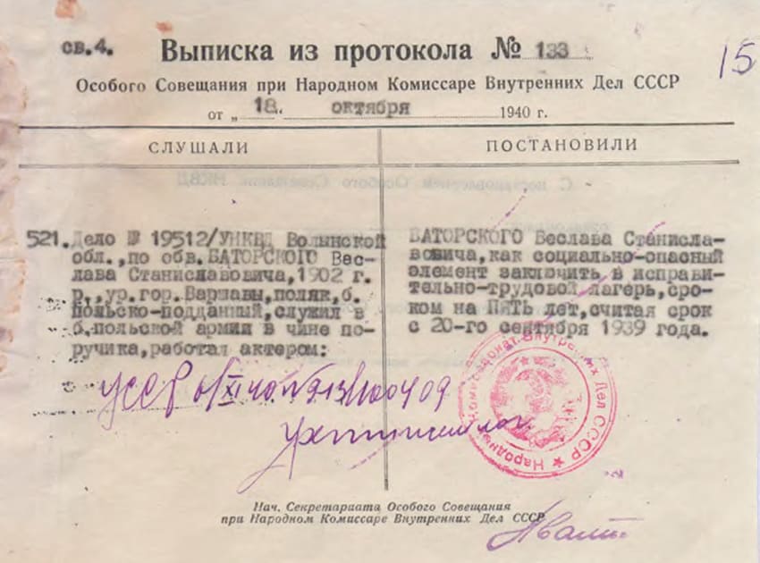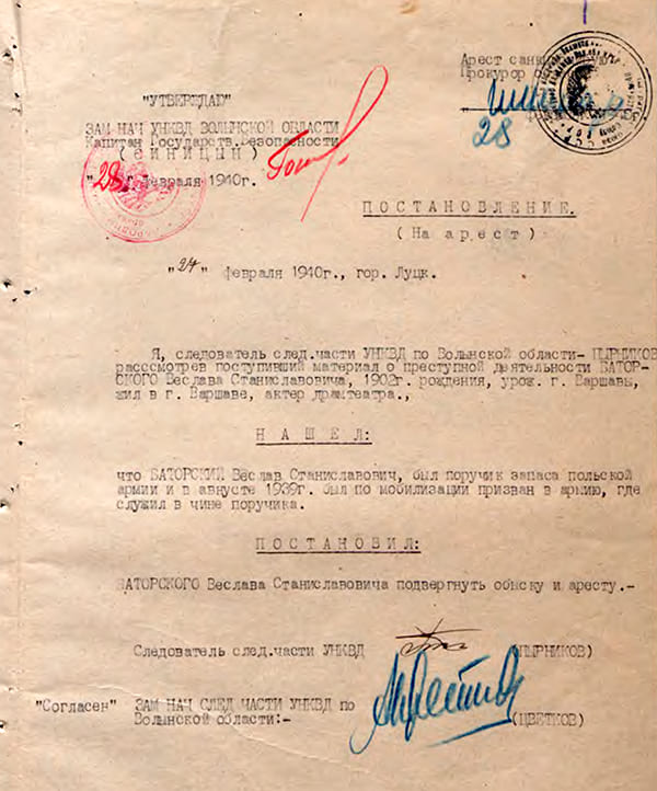 Nakaz aresztowania Wiesława Batorskiego został podpisany przez śledczego NKWD Pyrnikowa 24 lutego 1940 r., a przez zastępcę naczelnika Zarządu NKWD w Obwodzie Wołyńskim, kapitana bezpieczeństwa państwowego Sinicyna, 28 lutego 1940 r. To zwykła formalność, w której nie ma nic niezwykłego, ale… W tym konkretnym przypadku istnieją co najmniej dwa punkty, które w państwie prawa rodziłyby wiele pytań. Po pierwsze: w chwili podpisywania dokumentu Batorski już od pięciu (!) miesięcy przebywał w więzieniu. Po drugie: brak popełnienia przestępstwa.