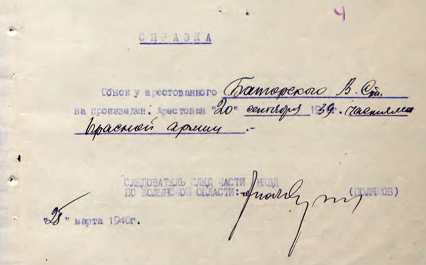 Ale nawet na tym się nie skończyło, ponieważ wszystkie procedury biurokratyczne musiały zostać dopełnione. Dwa miesiące później, 28 maja 1940 r., ten sam Pyrnikow doniósł w raporcie: «Podczas aresztowania i przeszukania Batorskiego W. nie przeprowadzono żadnej inwentaryzacji majątku, a pomieszczenia mieszkalne nie zostały opieczętowane».