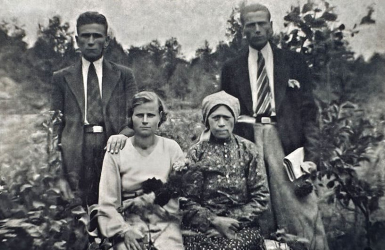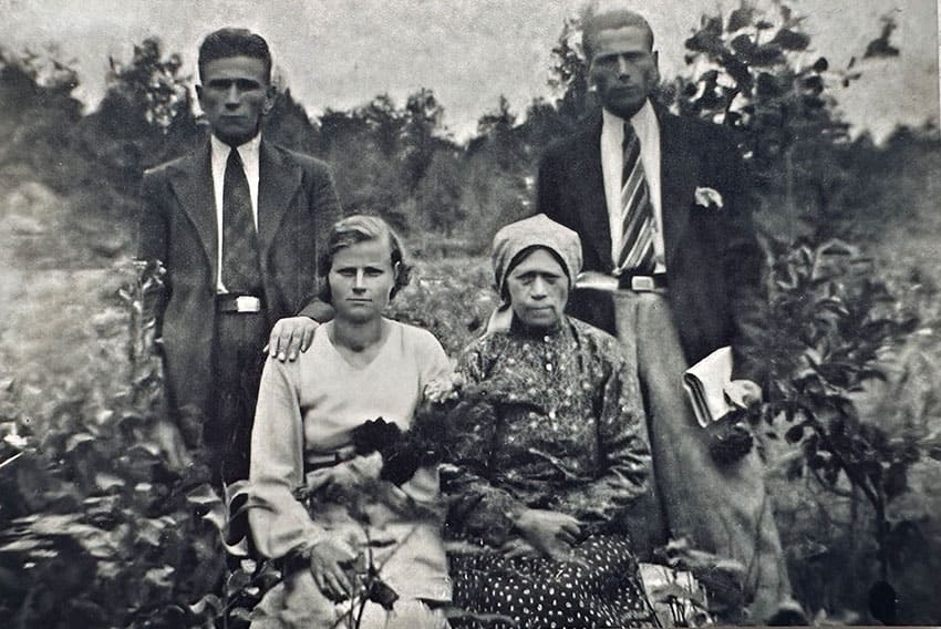 Rodzina Chytrych. Od lewej: siedzą Genowefa z matką Marią, stoją Wasyl i Jan. Kolonia Paniowo k. Jarynówki, 1935 r.