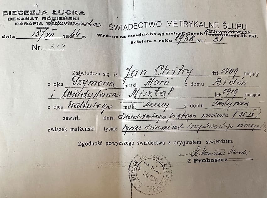 Świadectwo metrykalne ślubu Jana Chytrego i Władysławy Misztal. 1938 r.