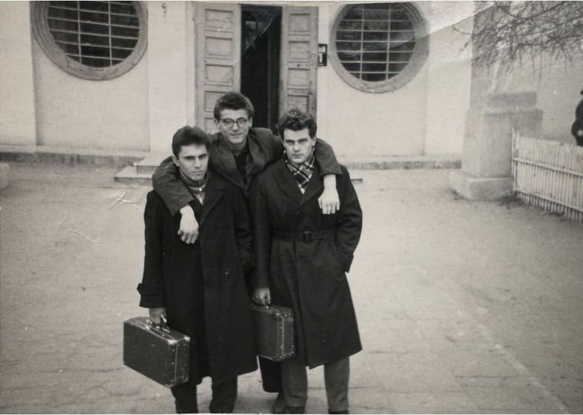 Czesław Chytry z kolegami przy kościele, w którym wówczas działała sala sportowa. Równe, 1961 r.
