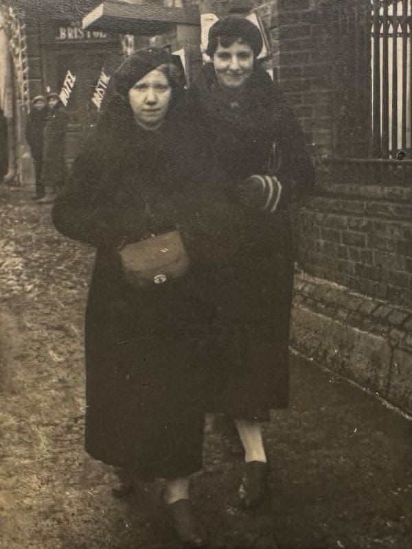 Siostry Władysława Misztal (po ślubie Chytra, po prawej) i Stefania Misztal przy kościele Świętego Antoniego. Równe, 1936 r.