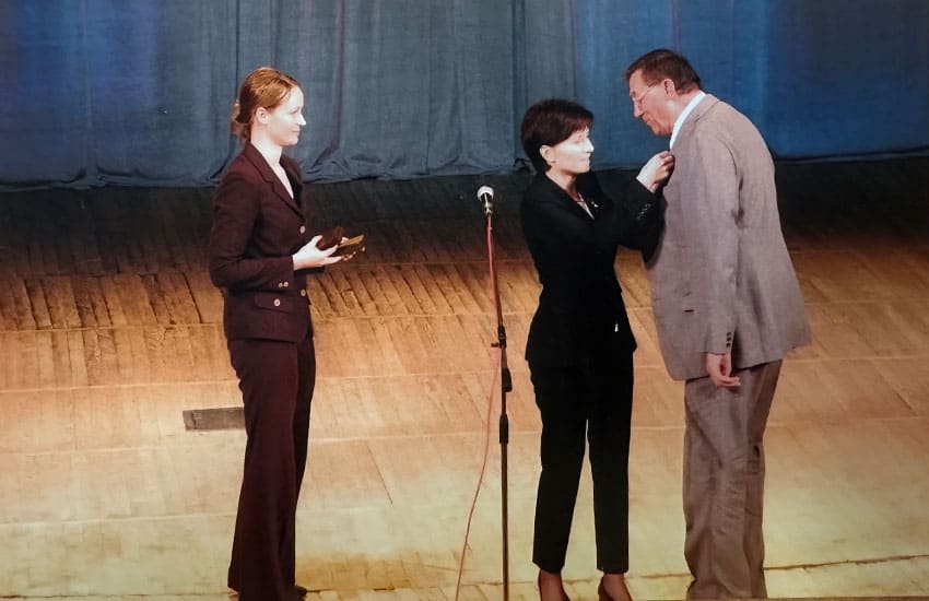 Czesław Chytry otrzymuje z rąk Konsul Generalnej RP w Łucku Beaty Brzywczy odznakę «Zasłużony dla Kultury Polskiej» nadaną przez Ministra Kultury i Dziedzictwa Narodowego RP. Równe, 2013 r.
