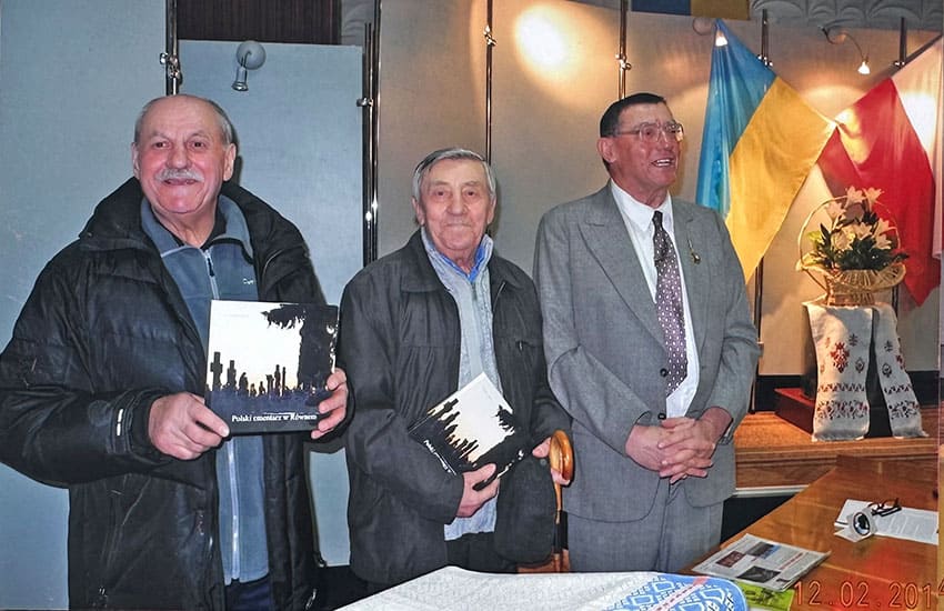 Czesław Chytry z braćmi Edwardem i Kazimierzem podczas prezentacji książki «Polski cmentarz w Równem». Równe, 2014 r.