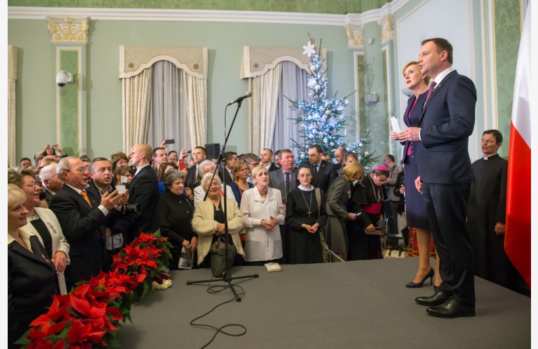 На завершення Анджей Дуда нагадав, що ми очікуємо на найкращі дні в році: «Це Святвечір та Різдво, коли ми збираємося з нашими родинами за святковими столами, коли співаємо колядки, коли й за межами Польщі є польськість, яка глибоко нас проймає. Також я радію, що разом із моєю дружиною ми можемо бути з Вами, поляками, тут, у Києві, у серці України. Я хотів би побажати Вам здорових, спокійних, сімейних Різдвяних свят та щасливого Нового року. Передайте ці привітання своїм близьким, своїм друзям, своїм організаціям, що об’єднують поляків, до яких Ви повернетеся після цієї зустрічі в Києві. Окрім загальних побажань щастя в новому році, я також хотів би Вам сказати, щоб Ви були задоволеними й гордими за свою Батьківщину».