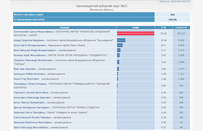 На Волині 17 липня у виборчому окрузі № 23 відбулися проміжні вибори до Верховної Ради. Перемогу на них здобула кандидат від партії «УКРОП» Ірина Констанкевич.