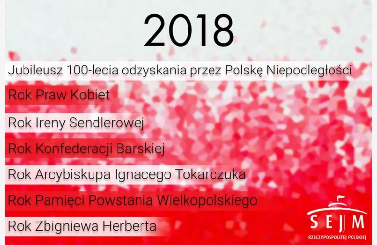 Окрім того, в цьому році по-особливому вшанують Великопольське повстання, Барську конфедерацію та права жінок. Згідно з рішенням Сейму, покровителями 2018 р. будуть Збігнев Герберт, Ірена Сендлерова та архієпископ Ігнацій Токарчук.