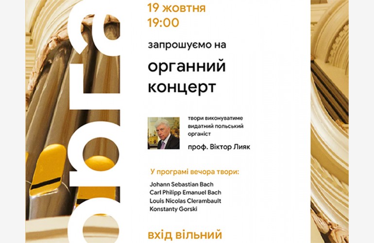 Луцький католицький собор знову відкриває свої двері шанувальникам класичної музики. У виконанні відомого варшавського органіста Віктора Лияка прозвучать шедеври Йоганна Себастьяна Баха – токатта, адажіо і фуга до мажор, а також хорал «Allein Gott in der Höh’ sei Ehr» («Єдиному Богу во вишніх хай буде честь»). Продовжить програму яскрава, але менш відома ІІІ соната іншого представника цієї славетної музичної династії – Карла Філіппа Емануеля Баха, сина Йоганна Себастьяна. Потім слухачі матимуть нагоду ознайомитися із творами французького композитора Луї-Ніколя Клерамбо, придворного музиканта короля Людовика XIV. Завершить програму органна фантазія фа мінор польського композитора Костянтина Горського, якого можна вважати й українським, адже він 29 років жив і творив у Харкові.