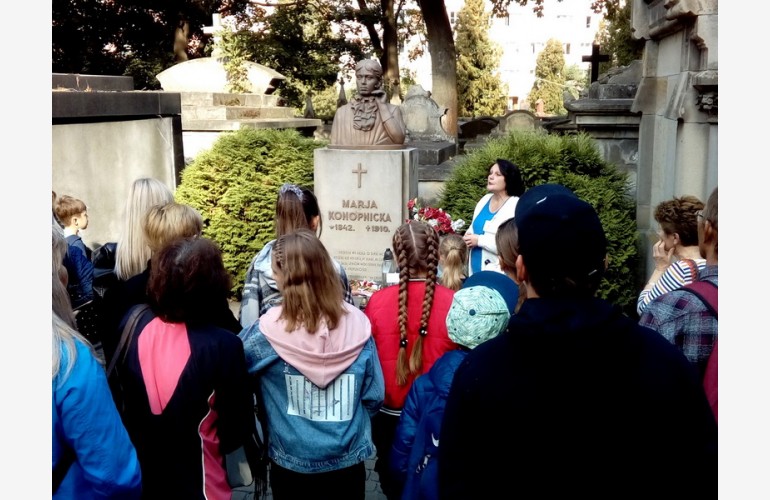 Спочатку група відвідала Личаківський цвинтар. Це особливе місце, де можна знайти могили багатьох видатних мешканців Львова. Здолбунівські учні побачили гробниці найвідоміших із них. Разом з екскурсоводом вони вирушили до надгробка видатної польської поетеси Марії Конопницької. Запалили лампадки на її могилі та пройшли кілька кроків далі. Тут біля надгробного пам’ятника Стефана Банаха послухали розповідь про цього геніального математика. Екскурсовод показала також місце вічного спочинку видатного архітектора Зигмунта Горголевського, архітектора, який проєктував, зокрема, Львівський театр опери та балету.