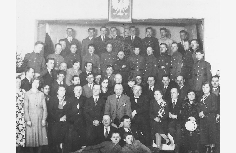 Оплаткова зустріч Стрілецького союзу в актовій залі загальноосвітньої школи в Білозірці. В першому ряді третій зліва сидить парох місцевої парафії, отець Ян Котвицький