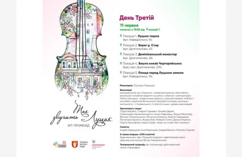 Управління туризму та промоції міста Луцької міської ради запрошує лучан та гостей міста на третій день арт-променаду «Так звучить Луцьк», який відбудеться 11 червня.