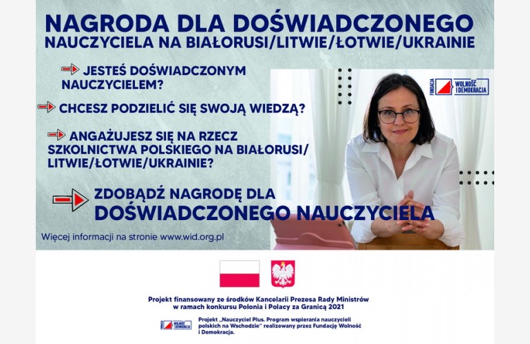Програму «Нагорода для досвідченого вчителя» в рамках проєкту «Вчитель ПЛЮС. Програма підтримки польських учителів на Сході» реалізує фонд «Свобода і демократія». Її мета – підтримка розвитку польськомовного стаціонарного та громадського шкільництва на Сході.
