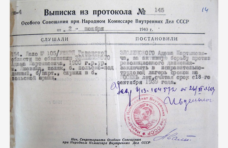 «Обвинувачується в тому, що служив у польській поліції», – таку графу можна побачити у спеціальному формулярі, на якому слідчі НКВС оформляли обвинувальний висновок. Є такий документ й у справі рівненського поліціянта Адама Здолинського.