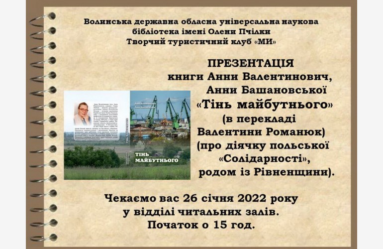 Як Анна Валентинович стала однією із засновниць польської «Солідарності»? Що зробило її відомою на цілий світ? Чому вона опинилася серед польської еліти під час фатального польоту президентського літака до російського Смоленська? – відповіді на ці та інші запитання можна буде отримати від перекладачки й журналістки Валентини Романюк під час презентації видання «Тінь майбутнього».