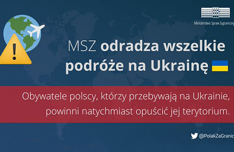 У зв’язку з військовими діями в Україні МЗС Польщі не радить здійснювати будь-які поїздки в Україну. Громадяни Польщі, які перебувають в Україні, повинні негайно покинути її територію. Про це повідомляє Посольство РП в Україні.
