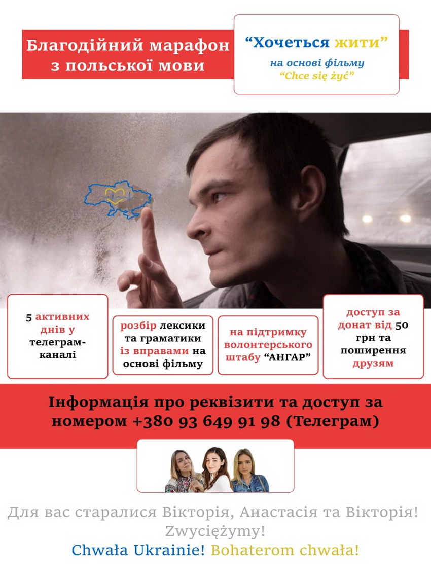 Любителів польського кіно та польської мови запрошують взяти участь у благодійному онлайн-марафоні «Хочеться жити». Серед умов участі – донат на суму 50 грн і більше.