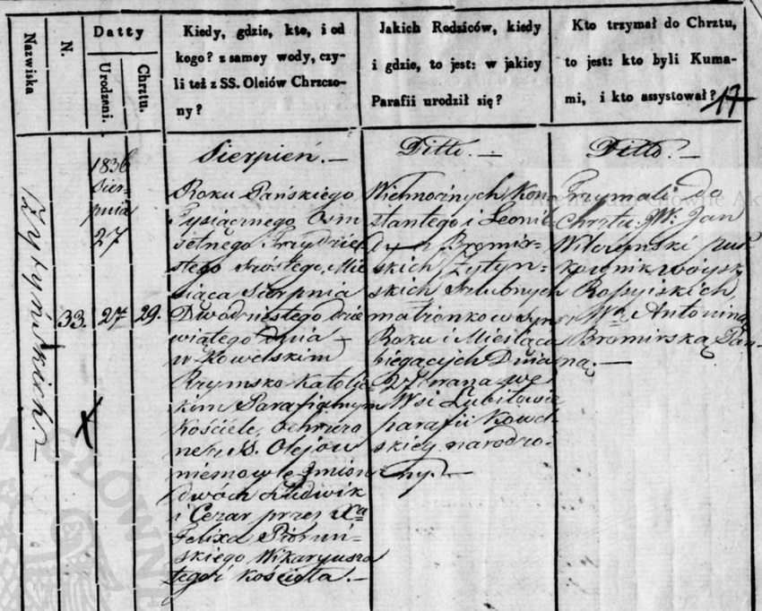 Метричний запис про хрещення Людвіка Житинського в Ковелі