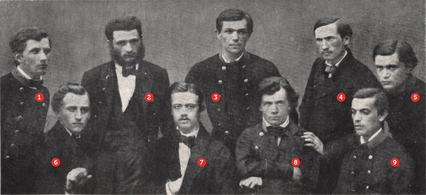 Студенти-поляки 4 курсу в 1859–1860 рр.: 1. Владислав Камінський. 2. Конрад Ґонсьоровський. 3. Леон Гловацький. 4. Людвік Житинський. 5. Володимир Антонович. 6. Людвік Левіцький. 7. Станіслав Мясковський. 8. Владислав Козловський. 9. Мар’ян Дубецький